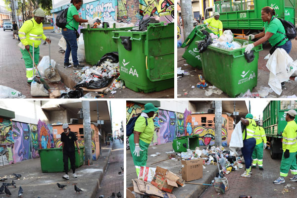 Botellas de vidrios, envases plásticos, tapas, cartones y restos de comida, entre otros residuos dispersos en la acera, fueron recogidos por la Autoridad de Aseo Urbano y Domiciliario AAUD, en La Peatonal.