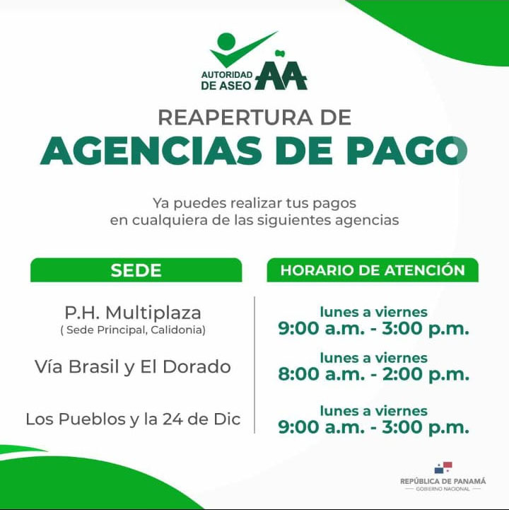 La Autoridad de Aseo Urbano y Domiciliario, informa a sus clientes que las Agencias de cobro ya están abiertas para que efectúen sus pagos.