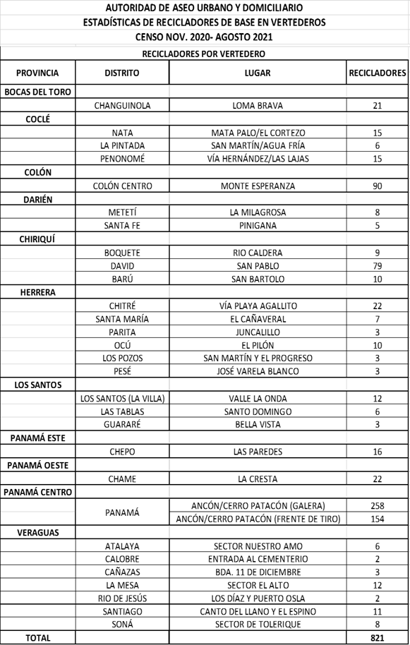 Se estima en más de mil Recicladores de Base en los vertederos a nivel nacional, según investigación de la Dirección de Servicios Técnicos de la Autoridad de Aseo Urbano y Domiciliario. En la República de Panamá no se cuenta con un registro nacional gubernamental de los Recicladores de Base en los Vertederos y como institución responsable adquirimos el compromiso de aportar indicadores en la “Mesa Técnica de Estadísticas e Indicadores Sociales” bajo la premisa de identificar a este grupo de personas, quienes son parte importante del interactuar en los vertederos tanto en la parte técnica como social, sin olvidar el valor e intercambio comercial de los materiales producto del reciclaje.
