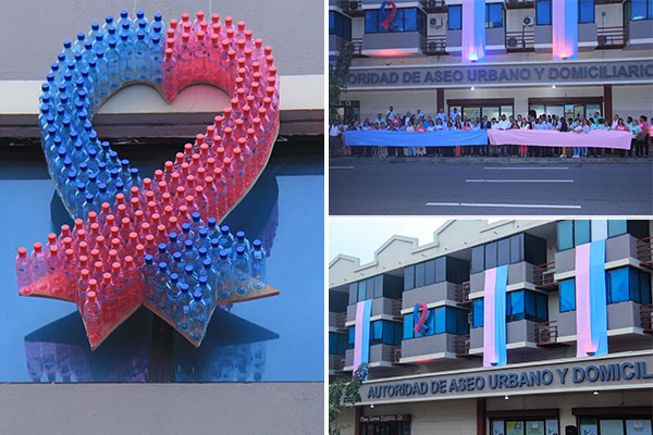 Unas 240 botellas plásticas, celestes y rosadas, fueron utilizadas para elaborar el gran Lazo Rosado y Celeste que simboliza la Campaña “Uniendo Fuerzas contra el Cáncer” y que engalana el edificio administrativo de la Autoridad de Aseo.